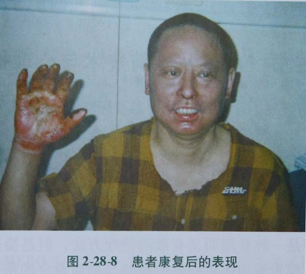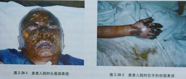 Ô½ÈÕ£¬»¼ÕßÍ·Ãæ²¿Ö×ÕÍÃ÷ÏÔ£¬É¢ÔÚСˮð壬²¿ÃÅ±íÆ¤ÍÑÂ䣬»ùµ×ºì°×Ïà¼ä£¬Í´¾õ³Ù¶Û£¬±ÇëÉÕ½¹µ«°ÎëÓÐÍ´¾õ£¬ÓÒÊÖ±íÆ¤ÍÑÂ䣬ÖжÈÖ×ÕÍ£¬»î¶¯Õϰ­£¬ÊÖÖ¸½¹ºÚÊÕËõ£¬ÊÖ±³³ÊÀ¯°×É«£¬Í´¾õÏûʧ ¡£¾Ý´Ë£¬¶Ô»¼Õß×ö³öÁ˽øÒ»²½Õï¶Ï£ºÍ·Ã沿¡¢ÓÒÊÖÉÕÉ˺ϲ¢Çá¶ÈÎüÈëÐÔËðÉË£¨×ÜÃæ»ýÔ¼6%£¬Ç³¢ò¶ÈÔ¼2%¡¢Éî¢ò¶È3%¡¢Ç³¢ó¶È1%£©£¬²¢È·Á¢ÕïÁÆ·½°¸£¬¹æ·¶¸÷Ïî²Ù×÷¼¼Êõ£¬»¼ÕßµÚ2Ì첡Çé¾ÍÓÐÁËÃ÷ÏÔºÃת£¬Ë«ÑÛ¡¢¿Ú´½Ö×ÕÍÃ÷ÏÔ¼õÇᣬÊÖÖ¸ÄÜÊʵ±»î¶¯ ¡£´´ÃæÓÚÉ˺óµÚ10ÌìÓúºÏ£¬ÓÒÊÖ±³¡¢Ö¸±³µÄ´´ÃæÔÚÉ˺óµÚ16Ìì»ù±¾ÓúºÏ£¬ÓÒÊÖ¹¦Ð§½«ÍêÈ«»Ö¸´£¨Í¼2ª²28ª²7£¬Í¼2ª²28ª²8£© ¡£