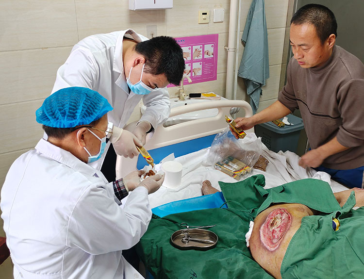 2月25日,受永兴县中医医院外二科何利军主任的邀请,《中国烧伤创疡杂志》编委、烧伤创疡再生医疗技术临床专家金党军,到科室加入科室查房、会诊多名创疡患者,为医护人员培训并进行了交流,之后亲自示范再生医疗技术换药流程。金主任还与骨科,内排泄科主任们一起探讨后期永兴县创面修复与再生医疗联盟建设和联盟技术指导单元的医护人员学习培训,旨在将再生医疗技术在永兴县基层医疗单元逐步普及和应用,为广大烧伤创疡患者带来福音。