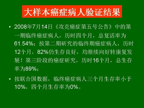 7、  第四阶段研究仍是免费研究,通常按规定执行研究计划的临终癌症患者均获得免费再生食疗 。
